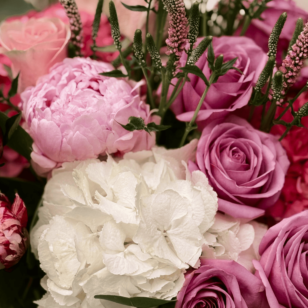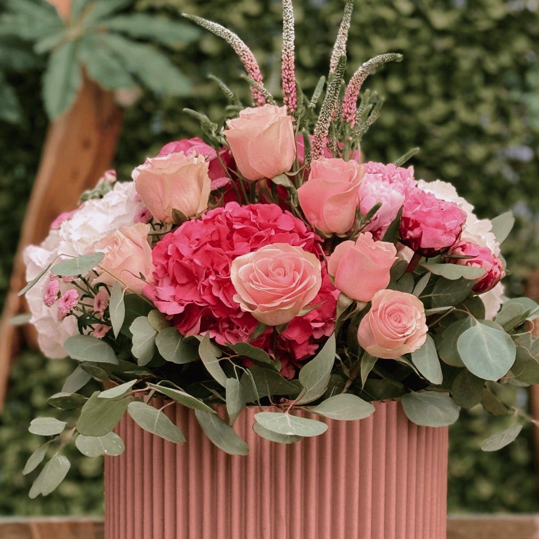 Chapeleira de flores variadas em tons de rosa. Ideal para oferecer em qualquer ocasião.