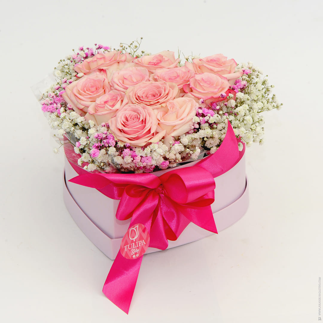 Chapeleira em formato coração com rosas cor-de-rosa.