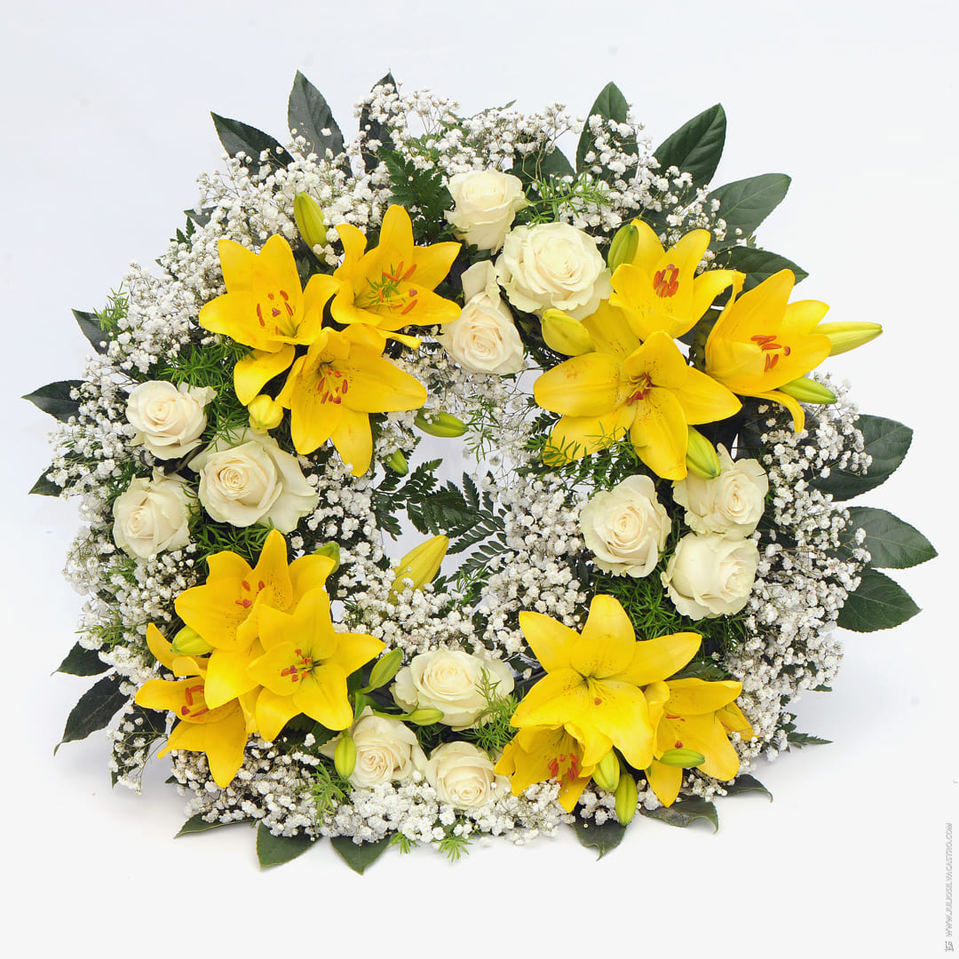 Coroa de flores em tons de amarelo e branco.