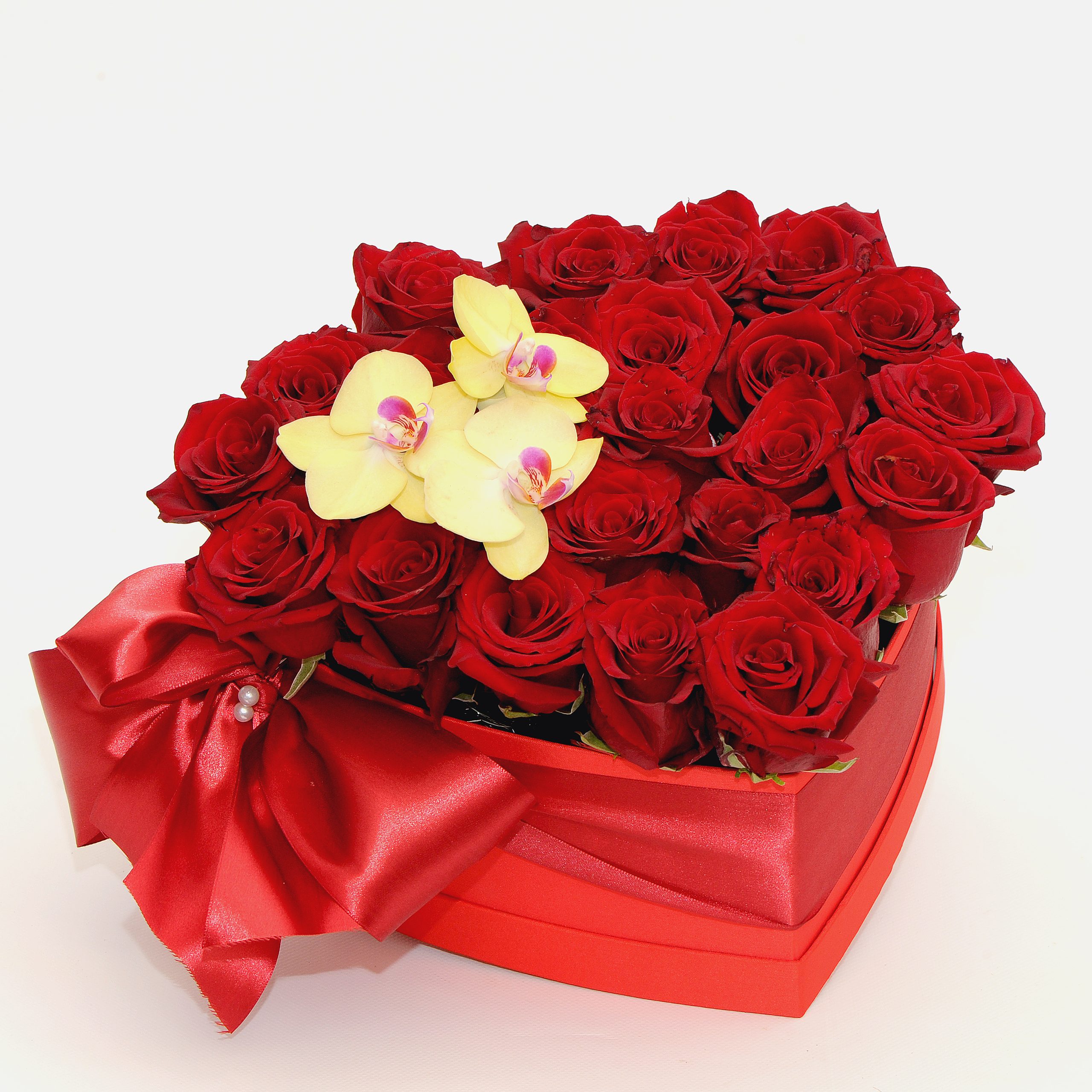 Caixa em formato de coração, com rosas vermelhas.