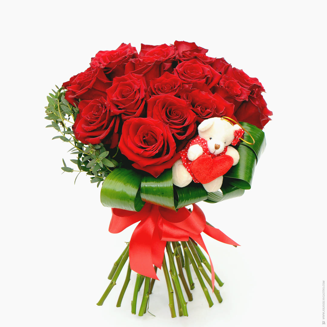 Bouquet de rosas vermelhas com urso de peluche e detalhes em verde.
